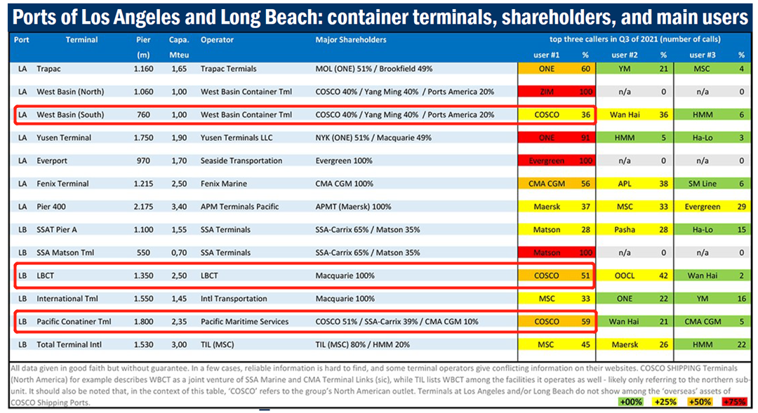 每個碼頭都有主要的股東以及使用者,每個船東都有自己控股或者占有主要股份碼頭,同一家船東的船,因掛靠在不同的碼頭,服務體驗以及提柜效率都不一樣。COSCO同樣是停靠在美西南岸,但是時效方面卻時快時慢。